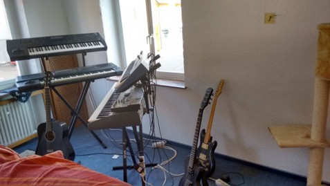 Das da rechts im Bild sieht zwar nicht so aus, aber das ist tatsächlich mein Wohnzimmer. Damit sollte das zweite Steckenpferd von mir eigentlich klar sein: Musik. Der Zufall wollte es, dass der Verlag, der den größten Teil meiner Geschichten unter Vertrag genommen hat, auch gleichzeitig ein Musikverlag ist. Und es war ausgerechnet die Professor-